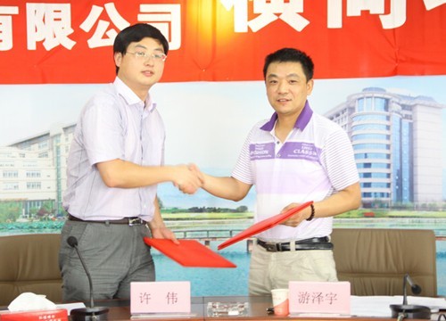 图为我校电子商务学院副院长许伟与家事易公司副总游泽宇签署协议 摄影:张承立
