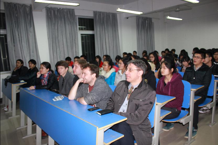 新闻中心讯(见习记者:刘特)3月12日晚,由我校国际合作交流处举办的“国际活动月”在外语楼114室拉开序幕,其系列活动之一——“外教面对面”第一场开讲。我校外教老师Christopher Bond和我校学生分享了他的国外大学生活以及在中国的外教生活,为即将出国留学的学生增添了信心。
