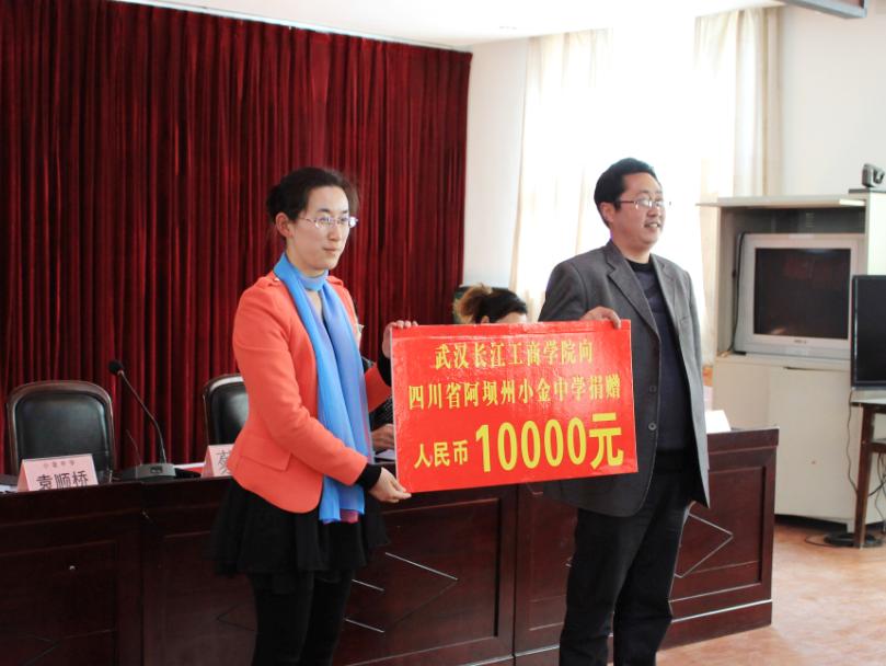 图为 蔡菁老师代表我校向小金中学捐赠1万元