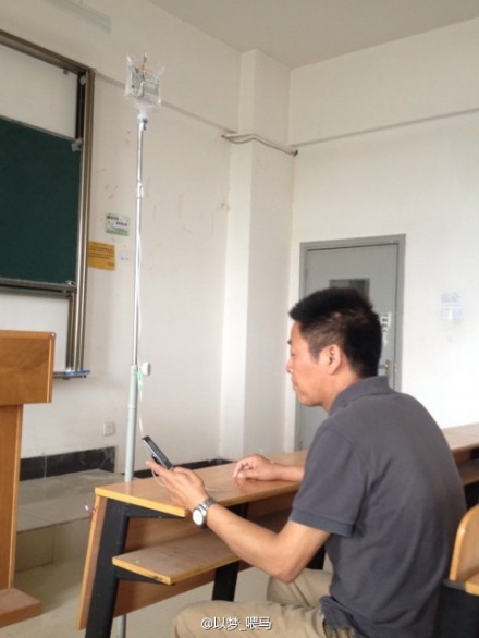 据了解,经医生检查,李纪明老师因颈椎疲劳引起的脑供血不足,导致脑部缺氧,需要长期的治疗,这已经是他打了一个星期的吊针了。为了不耽误学生的上课进度,李老师不听医生劝阻,坚持打着点滴上课。