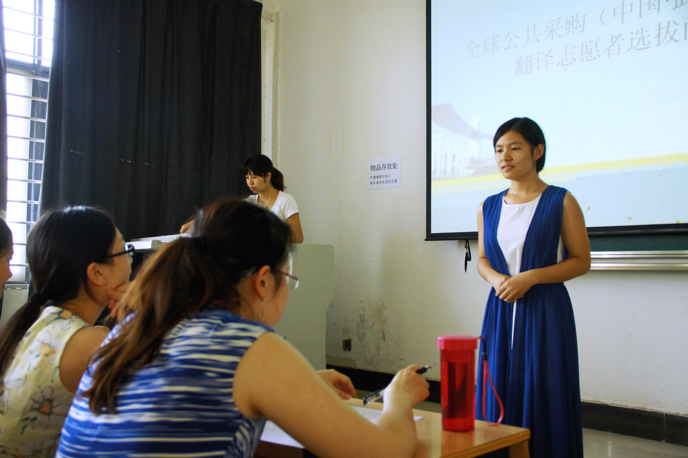 新闻中心讯(通讯员 张攀)今年10月,全球公共采购论坛暨公共采购展览会将在武汉召开,参展的澳大利亚葡萄酒供应商委托我校选派志愿者为其提供翻译服务。8月30日下午2点,在我校综合楼210教室,经济与商务外语学院组织开展翻译志愿者选拔活动,我校57名学生参加了第一轮面试。