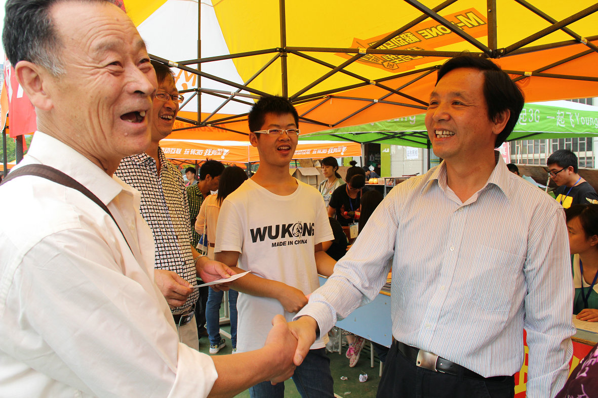 在电子商务学院迎新接待处,张金隆校长和一位新生及家长们高兴地畅谈了起来,他鼓励这位新生在学校好好学习,将来以优秀的成绩回报父母和社会,并欢迎家长们经常来校看看。