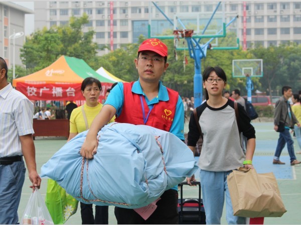 图为青协志愿者为新生拿行李 摄影:张攀