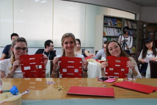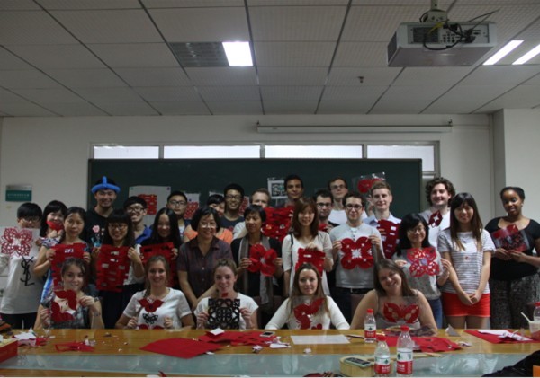 体验完传统的民俗节日之后,中国剪纸协会会员、民间艺术家张洁群也给留学生上了一堂绘声绘色的剪纸课。19名留学生跟着老师有板有眼的学剪纸。将一张纸折叠两次,中线放左手,开口放右手,然后分成三等份,再动两剪刀,一个“囍”字就成形了。随后,留学生们还饶有兴致地学着剪蝴蝶。