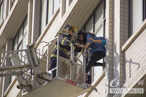 (长江网新闻记者 蓝静 莫玉津)“同学们!发生火灾了,一定不要慌张,请拿起身边的湿毛巾捂住口鼻,有序地沿着墙壁和楼梯疏散……”11月7日,在武汉长江工商学院综合楼三楼教室,学生用湿毛巾捂着口鼻,朝窗外挥手“求救”,在消防官兵的指导下,“被困”学生安全逃离到教学楼前的空地,被疏散到指定位置。这是发生在该校 “‘119’防灾减灾消防演练活动”上的一个场景。该校千余名师生共同参与了此次消防演练活动,学习消防知识。