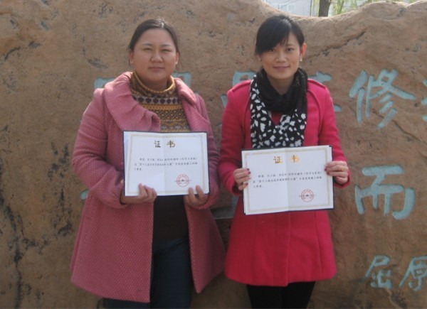 图为刘少敏老师和薛莲老师手捧荣誉证书