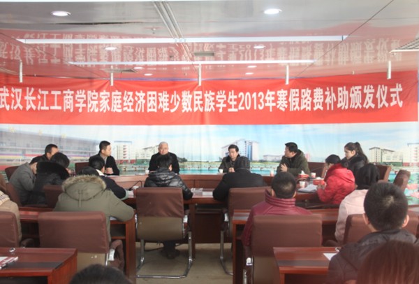 新闻中心讯(记者 韦晴)12月27日上午,武汉长江工商学院召开家庭经济困难少数民族学生2013年寒假路费补助颁发仪式,来自新疆、宁夏等地区的117名家庭经济困难的少数民族学生领到了寒假路费补助共计22000多元。该活动在湖北日报传媒集团楚天报刊发行总公司的大力支持下展开。
