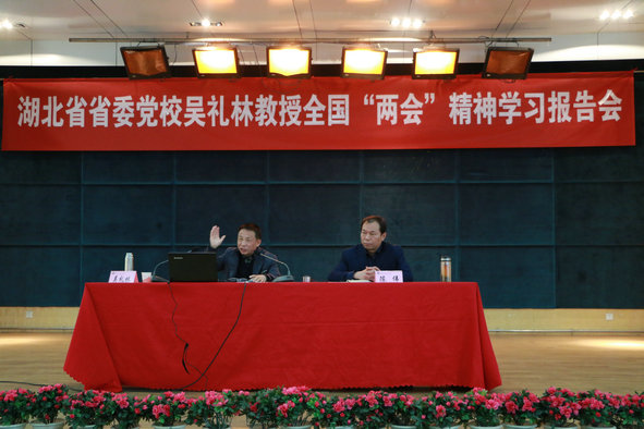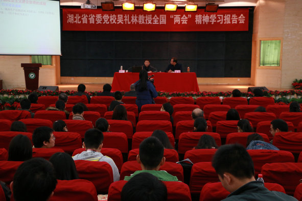 新闻中心讯(记者 熊晓艳)3月20日下午,武汉长江工商学院在学术报告厅召开了2014年全国“两会”精神学习报告会,湖北省委党校政法教研部吴礼林教授作学习传达“两会”精神报告。该校党委书记陈伟、党委副书记向太斌出席报告会,副部级以上干部(含副部级)、学校公共基础课部教师及教工党员、学生党员、入党积极分子代表听取了报告,会议由陈伟书记主持。