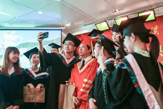 面对多个手机镜头同时铺面而来,张金隆校长有求必应,始终微笑地配合毕业生们拍好每一张自拍照,还打趣地问:“拍得好看吗?”,拍得不满意的还请毕业生们再拍一张。