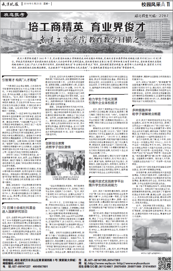 他们不是特例。据了解,近3年来,该校毕业生一次性就业率在91%以上,2013年毕业生一次性就业率为92.24%。该校毕业生中涌现出考取5所国外名校硕士研究生的“学霸”刘长安等一批深造典型,“毕业4年资产过亿”的“创业哥”罗群等一批创业典型,“武汉高校霸气哥”黄小松等一批就业典型,全国最美乡村教师、湖北省人大代表、“全国就业创业先进个人”邓丽等一批先进典型。