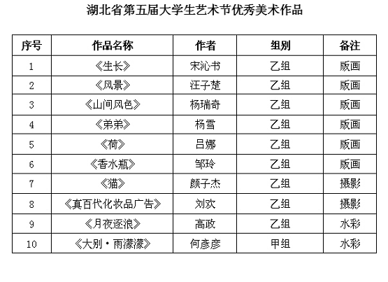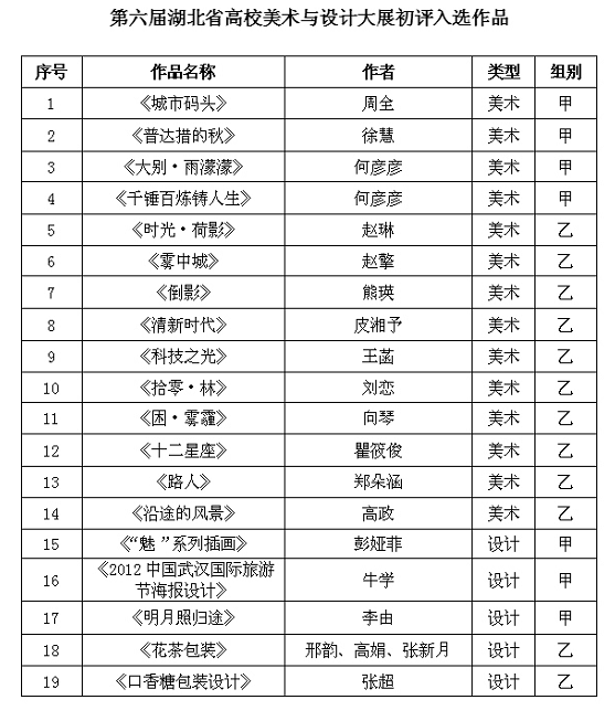 今年8月,该院师生的19件作品顺利通过由湖北省文化厅和湖北省教育厅主办的第六届湖北省高校美术与设计大展初评,目前在复评之中。其中教师作品7件,分别是李由《明月照归途》、牛学《2012中国武汉国际旅游节海报设计》、彭娅菲《“魅”系列插画》、周全《城市码头》、徐慧《普达措的秋》、何彥彦《大别雨濛濛》、《千锤百炼铸人生》;学生作品12件。另外,10件师生作品入选第五届大学生艺术节。