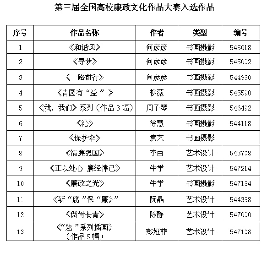 今年8月,该院师生的13件书画摄影类和艺术设计类作品参加了由教育部高思想政治教育司主办的“崇德向善•勤廉笃实——第三届全国高校廉政文化作品征集暨廉洁教育系列活动”。