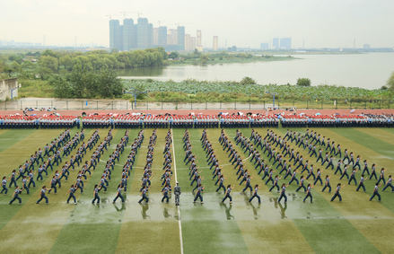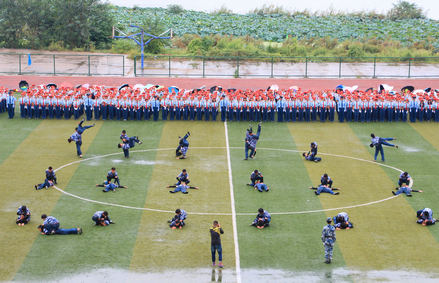 随后,军体拳表演开始,来自各学院方阵精英组成3个军体拳方阵分别进行了男女军体拳术、对博、武术格斗的表演,他们动作齐整,口号响亮,每一招式都威武有力,充分展示了新生们半月来的军训成果。