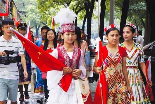 记者在现场看到,15名身着维吾尔族、蒙古族、哈萨克族、畲族服饰的少数民族大学生一家家敲开居民的门,送上国旗。