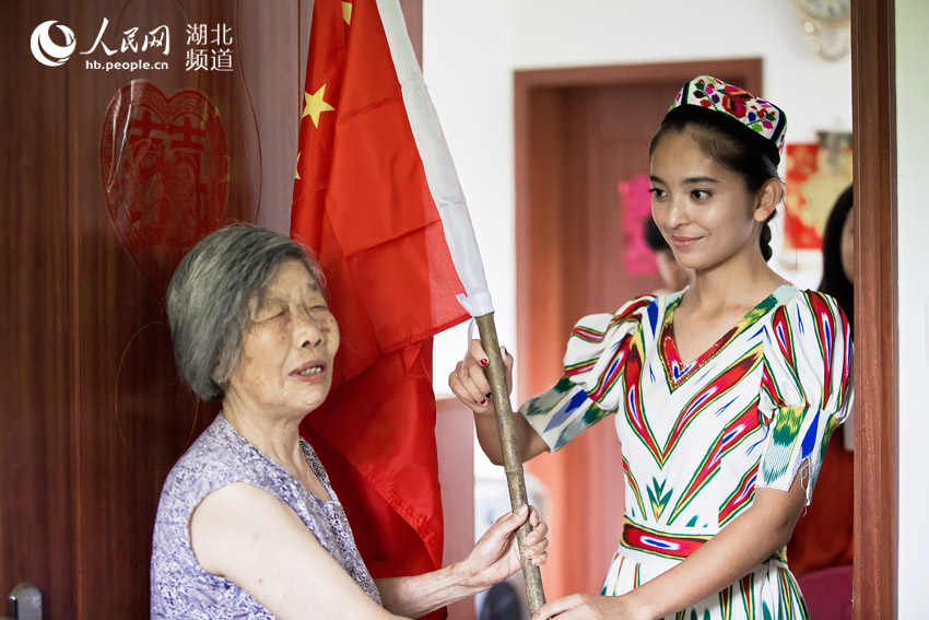 新葡的京集团35222vip民族教育学院维吾尔族学生阿丽米热,热情地敲开了80岁婆婆张华荣的大门,将红旗送到她的手中。