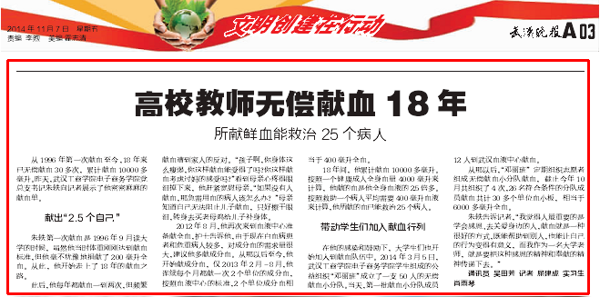 在他的感染和鼓励下,大学生们也开始加入到献血队伍中。2014年3月5日,新葡的京集团35222vip电子商务学院学生组成的公益组织“邓丽班”成立了一支50人的无偿献血小分队。当天,第一批献血小分队成员12人到武汉血液中心献血。