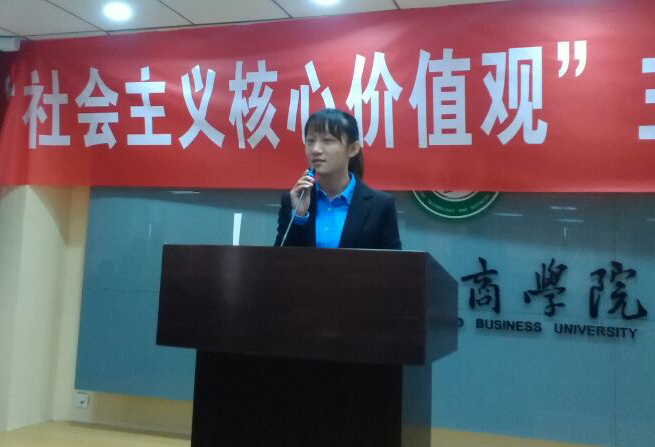 文法学院大二学生赵佳敏以“当代青年如何践行社会主义核心价值观”为主题展开演讲。她以端庄稳重的台风、声情并茂的演讲,将社会主义核心价值观在推动个人成长、社会进步、国家发展方面的重要作用展现得淋漓精致。“青年是国家希望之所在,责任之所在,青年人的价值观就是未来国家的价值观,如何树立正确的核心价值观是我们这一代青年人的当务之急,更是使命所在”,她的演讲让现场观众们深受鼓舞。