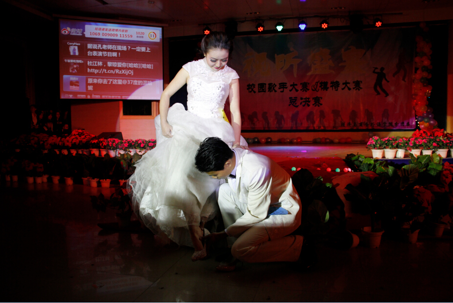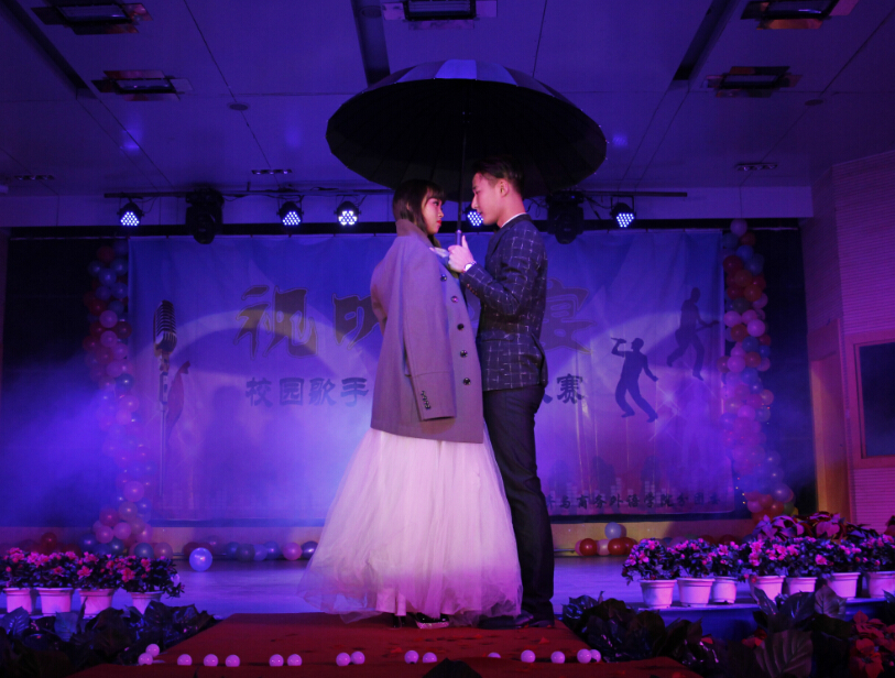 新闻中心讯(记者 韦晴 林典)男生掏出戒指,向身着唯美婚纱的曼妙女生“求婚”。他为她穿上水晶鞋,为她披上外套,为她打着伞;深情的对望,温暖的公主抱……这不是集体求婚现场,而是12月5日新葡的京集团35222vip经外学院在学术报告厅上演的“模特大赛”比拼环节。经过精心准备,12对男女身着由学校学生设计的服装登上T台。现场除了婚纱秀外,还有帅气的篮球运动风、优美典雅的民国风等吸引观众眼球。