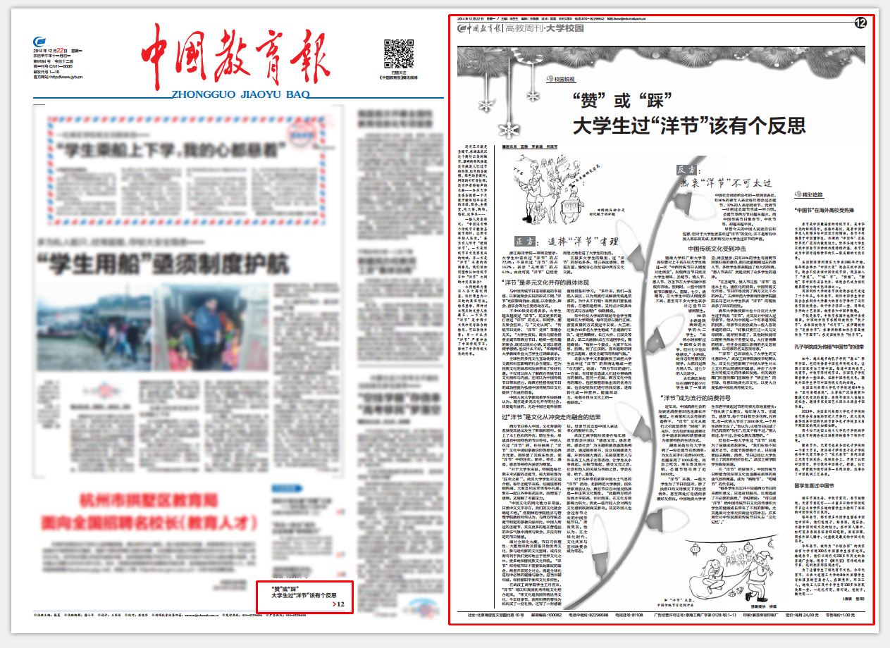 “‘洋节’已深深植入了大学生的文化意识中。”新葡的京集团35222vip教授李纪明认为,洋文化已经影响了中国大学生对本土文化的认同感和归属感,冲击了大学生对传统文化的传承和发扬,相关政府部门和宣传部门应该给予“矫正性”的引导,有意识地淡化洋文化,以更大力度弘扬中国优秀传统文化。