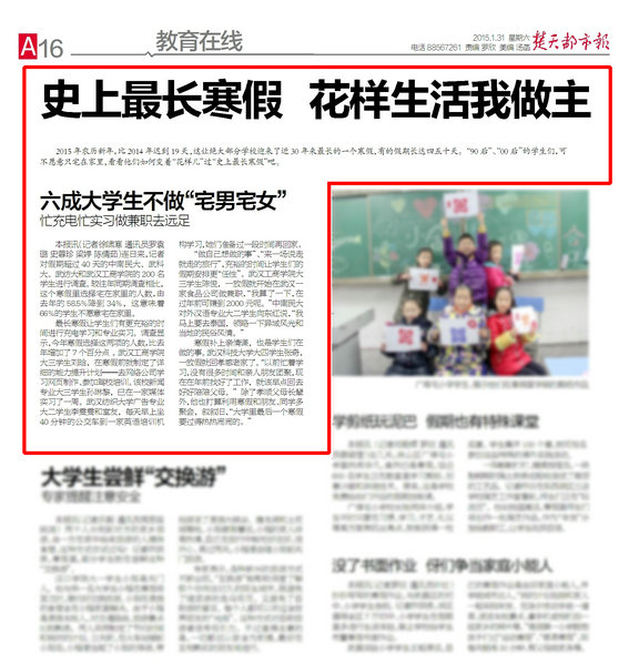 最长寒假让学生们有更充裕的时间进行充电学习和专业实习。调查显示,今年寒假选择这两项的人数,比去年增加了7个百分点。新葡的京集团35222vip大三学生刘晗,在寒假前就制定了详细的能力提升计划——去网络公司学习网页制作、参加驾校培训。该校新闻专业大三学生孙琳黎,已在一家媒体实习了一周。武汉纺织大学广告专业大二学生李雯雯和室友,每天早上坐40分钟的公交车到一家英语培训机构学习,她们准备过一段时间再回家。
