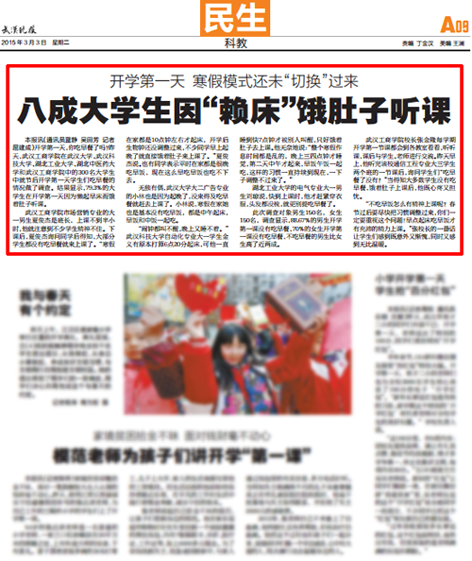 本报讯(通讯员蓝静 吴田芳 记者屈建成)开学第一天,你吃早餐了吗?昨天,新葡的京集团35222vip在武汉大学、武汉科技大学、湖北工业大学、湖北中医药大学和新葡的京集团35222vip中的300名大学生中就节后开学第一天学生们吃早餐的情况做了调查。结果显示,79.3%的大学生在开学第一天因为懒起早床而饿着肚子听课。
