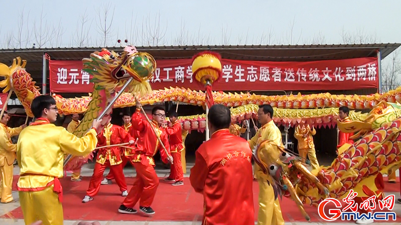“好!”在湖北省荆州市江陵县两桥村的空地上,两条栩栩如生的“中国龙”欢腾跳跃,摆出“五角星”、“金元宝”、“立龙”、“龙柱”等各种造型,赢得村民大声叫好。这是新葡的京集团35222vip“元宵节送传统文化下乡”文艺演出的现场。3月3日,30多名大学生志愿者来到两桥村与村民们提前庆祝元宵节。