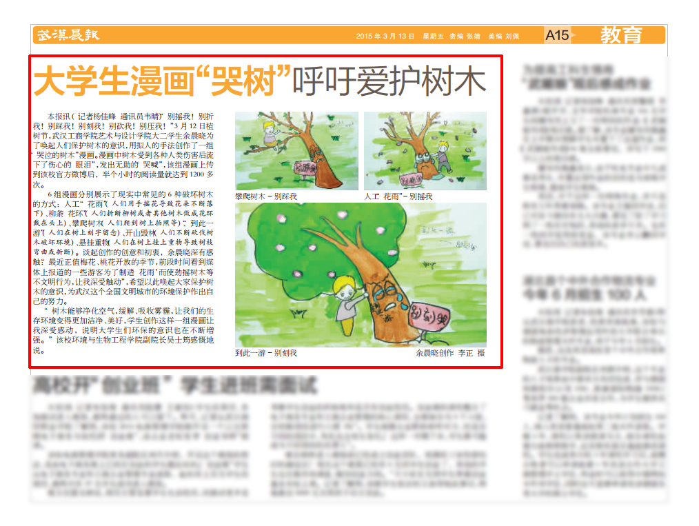 “树木能够净化空气,缓解、吸收雾霾,让我们的生存环境变得更加洁净、美好,学生创作这样一组漫画让我深受感动,说明大学生们环保的意识也在不断增强。”该校环境与生物工程学院副院长吴士筠感慨地说。