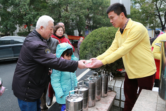 图为青协志愿者向社区居民赠送元宵 林典摄