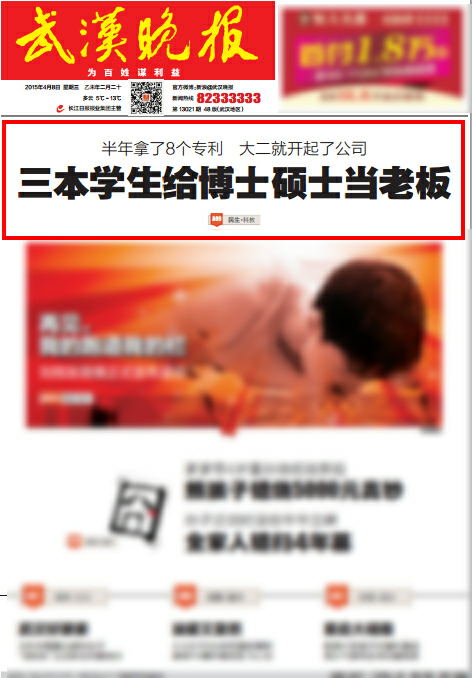 去年10月,刚上大二的他,用自己的专利在招商银行贷款20万元开办了武汉晟博亚科知识产权咨询服务有限责任公司,成为自主创业的90后CEO。并通过互联网招聘了志同道合的3名博士生、硕士生。