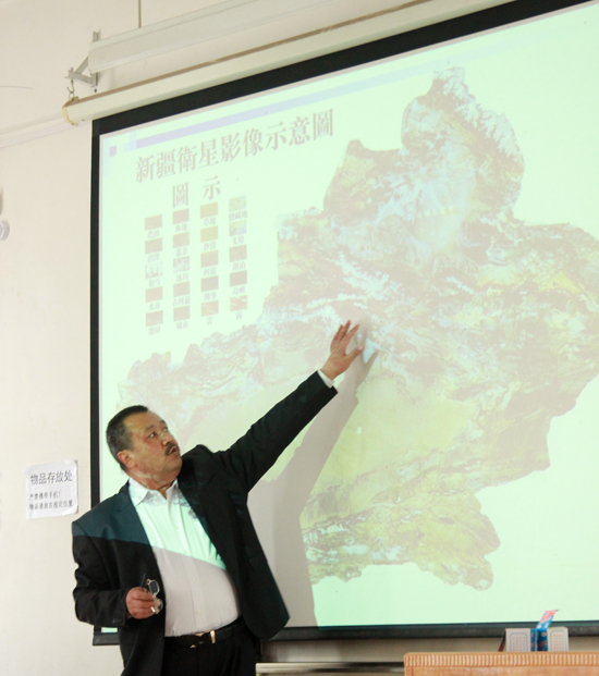 图为阿布力米提·苏皮老师正在介绍新疆地理环境 摄影:李彩虹