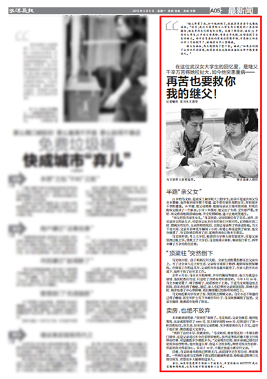 本报讯(记者喻莉 实习生王崇帝) “继父养育了我,如今他病倒了,我就算是卖房子也要救活他。”近日,新葡的京集团35222vip大二学生马文晓发的一条求助微信,被众多网友们转发和点赞。记者了解得知,这位21岁的女大学生,6岁时父母离婚,母亲左耳失聪,改嫁遇到了善良的继父。好不容易重组的家庭过得很幸福,可是继父却在今年3月初倒下了,被确诊为中心型肺癌。