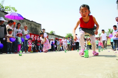 “插秧”比赛中,起点至终点,间隔摆放着6个空瓶,每个小朋友需要沿着空瓶,将手中的六根吸管一根一根的插进六个空瓶中,时间最少者为胜。刚刚就读二年级的邱杨慧不到二分钟就完成了“任务”,“奶奶在田里插秧也是这样沿着一条线一排排地插进去,我看着看着就学会了。”