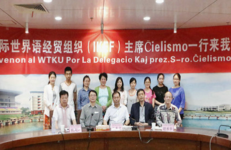 在会谈中,陈伟书记代表学校向Ĉielismo主席一行介绍了会议的筹备情况,他表示,学校董事长、校长高度重视此次会议的承办工作,对各项具体工作都提出了明确的目标和要求。国际世界语经贸组织一行还对学校培训世界语志愿者的举措给予高度赞赏并用世界语与该校8位志愿者进行了亲切交谈。