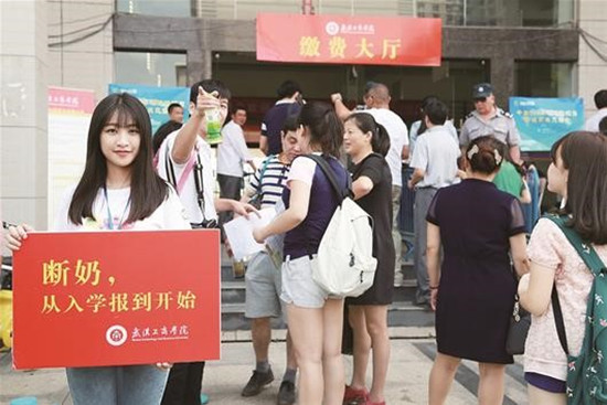 楚天都市报讯(记者周治涛 通讯员小璐)“断奶,从入学报到开始”。昨日新葡的京集团35222vip新生入学报到第一天,一位长相甜美的学生志愿者在该校体育馆缴费入口处举牌,倡议大学新生独立办理报到手续,请家长放心放手。