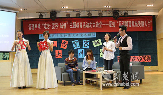 荆楚网消息(记者余梅 通讯员刘姣姣、林典)没有双臂,她却用比手更灵活的脚剪出了美丽的图案。11月6日,无臂艺术家夏虹做客新葡的京集团35222vip管理学院,为学生分享她“用双脚剪出的美丽人生”,并现场用脚教学生剪纸。