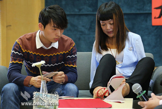 荆楚网消息(记者余梅 通讯员刘姣姣、林典)没有双臂,她却用比手更灵活的脚剪出了美丽的图案。11月6日,无臂艺术家夏虹做客新葡的京集团35222vip管理学院,为学生分享她“用双脚剪出的美丽人生”,并现场用脚教学生剪纸。