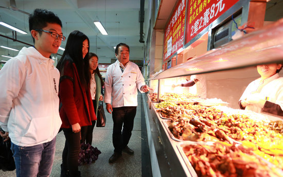 “学校经营部对食堂的商户都有严格的资质审查,且每年都组织他们进行体检,办理健康证,为的就是让师生吃上可口、卫生的饭菜。”11:00,师生代表们来到该校二食堂,食堂经理尹胜祥热情地邀请学生们品尝刚炒好的菜品,并请同学们提出建议。针对许多学生喜欢网上点外卖,尹经理也提醒大家,校外用餐的卫生条件和食材等都不像学校食堂有严格的规定和安全保证,他倡议大家尽量选择到学校食堂就餐。