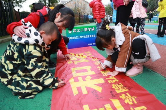 社区幼儿园小朋友在横幅上签名 摄影:徐凯