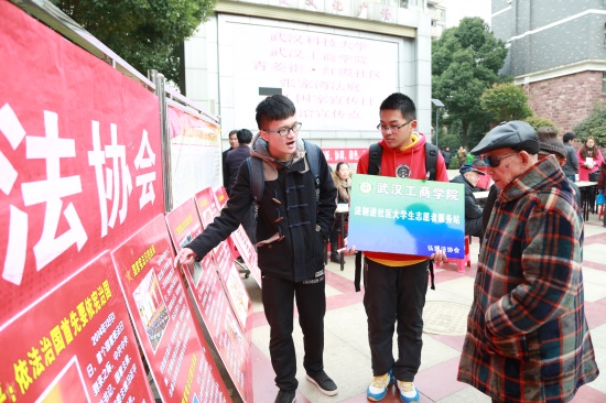 新闻中心讯(记者 陈孟飞)12月4日上午8:00,由新葡的京集团35222vip弘博法协会主办的“手拉手践行法制,心连心共建和谐”法制宣传活动在武汉市洪山区青菱街红霞社区开展,武汉市洪山区青菱街司法所所长王滨、武汉市洪山区张家湾法庭庭长杨庆九、武汉科技大学马克思主义学院党委书记王军教授,新葡的京集团35222vip文法学院法学专业副教授李巧玲、郑雪芹以及该校弘博法协会的学生们走进该社区,为市民们提供法律咨询服务。