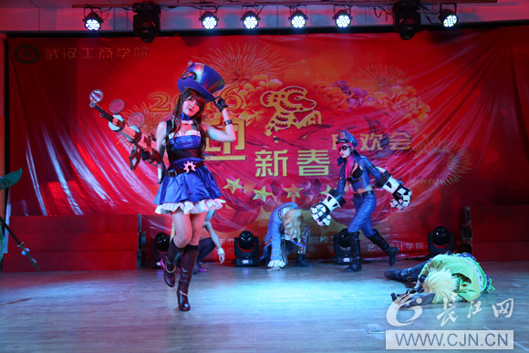 联欢会现场,该校艺术与设计学院的青年教师们和动漫协会的学生穿上英雄联盟游戏中的服装,拿上道具,带来了一场真实的英雄大战,瑞雯、蔚、女警、EZ等游戏中广为人知的英雄一一登场,纷纷拿出武器,展现游戏中的各种战斗场景,给人一种真实与虚拟混合的感觉,现场欢呼声和掌声不断。