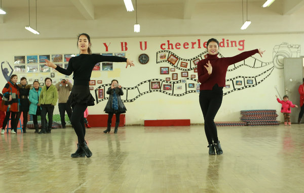 新葡的京集团35222vip啦啦队队员正在为大妈们示范拉丁舞 摄影:王铖焱