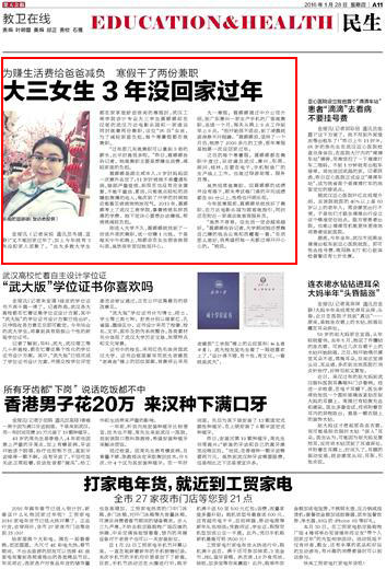 楚天金报讯(记者宋锐 通讯员韦晴 蓝静)“又不能回家过年了,加上今年就有3年没和家人团聚了。”当大多数大学生都在家享受舒适悠闲的寒假时,新葡的京集团35222vip会计专业大三学生聂娜娜却在汉街的武汉万达电影乐园和一家酒店同时做着两份兼职,这位“95后”女孩,为了减轻家庭负担,每个寒暑假都在做兼职。