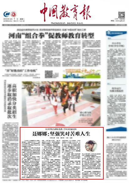 在同学眼里,娜娜是个开朗乐观的女孩,每天嘻嘻哈哈、开开心心的,从未看到她抱怨过什么。“我们都叫她开心果,因为她脸上总是挂着笑,你根本看不到她有什么辛苦和心酸。即使迫于生活到处做兼职,但是每每谈起各种工作中的趣事,她也能笑开花。”聂娜娜的室友石芸琳说,室友们都被她坚强乐观的精神感染着。