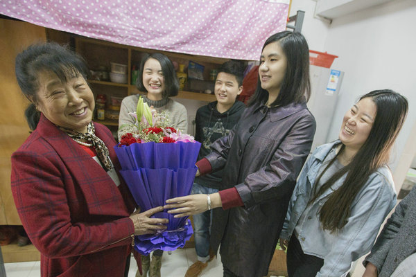 吴新梅阿姨收到了同学们送来的鲜花 摄影:王铖焱