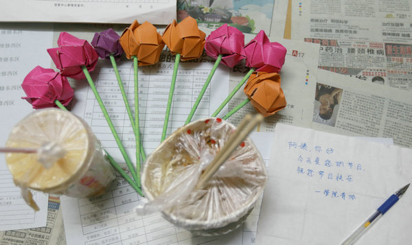 志愿者为阿姨送上手工玫瑰花 摄影:代悦涵