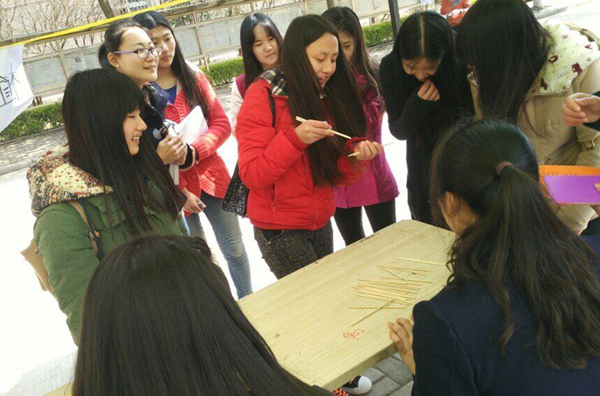 “哎!又碰到旁边的竹签了!”参加活动的该校大二学生程雪是第三次挑战“挑竹签”游戏了,“挑竹签要求在一堆散乱的竹签中抽出一根竹签,要小心翼翼不能碰动其他的竹签,讲究时机也很考验判断力。”在第四次挑战中,程雪在杂乱的竹签中选择了一根最接近外围的竹签,屏住呼吸,弯着腰,然后一咬牙快速抽出,最后成功的完成了挑战,“我感觉很兴奋,经过不断的挑战得来的种子更显其珍贵,我一定会好好栽培的。”程雪拿到种子后兴奋的说道。