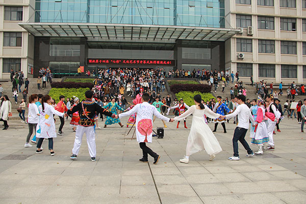 在综合楼广场中央摆放着手工制作的篝火堆,来自全校不同学院的同学们身着自己设计的代表七彩和各个学院特色的服装,手牵手围成圆圈欢快地跳起了舞蹈,火热的场面让大家眼前一亮。综合楼广场左侧放置着各个学院亲手书写的毛笔字“马到成功”,校党委书记陈伟也挥墨泼豪写下“宁静致远”四个大字。