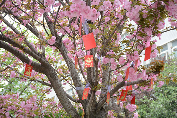 一食堂前樱花林是开幕式的第三站,工作人员们将气球、丝带、红包等装饰品绑在8棵樱花树上,漫步其中,犹如置身于一片浪漫的红包雨中,而红包里面也设置了各类奖品,包含欢乐谷夜场门票、电影兑换票、抱枕娃娃、现金、礼品袋等。身着卡通服的工作人员也在现场指引着同学们玩游戏,并给来往的同学们发放气球与纪念品。