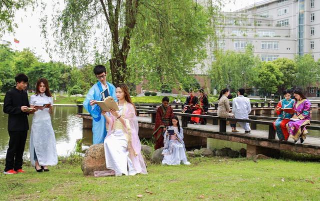 (通讯员 林倩 何育钦 摄影 王铖焱)4月19日下午,新葡的京集团35222vip12名身着汉、唐、宋、清、明和民国6个不同时期服饰的大学生,手捧《史记》、《唐诗宋词》、《弟子规》等国学书籍,在该校静思湖旁举办的“送古韵、传经典”古诗词朗诵比赛,形成一道亮丽的风景线,引来不少人前来围观。