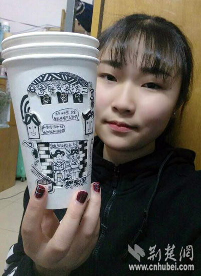 荆楚网讯 (记者 安立 通讯员 范博文 吴田芳)“纸杯讲述一对父女俩在户部巷过早饭,粗心的父亲掏钱时,手机和硬币一起掉到地上,女儿调侃父亲说,把手机话费都摔出来了。”新葡的京集团35222vip大一女生韦佳敏,将三个一次性纸杯镂空叠加成“杯具”卡通故事,受企业热捧。